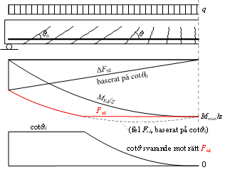 Som jag tolkar det kan jag egentligen inte använda den första formeln för beräkning av enskilda stänger, men då blir resultatet att jag alltid ska tvärkraftsarmera med byglar i 90 grader för det blir bättre kapacitet, men så är väl inte i verkligheten? Eller får jag använda cot θ faktorn även på ett fåtal stänger? Blir mer rimliga värden på kapaciteten och det stämmer bättre med tidigare koder. Har en formel från betonghandbogen (16b sid 246) som ger en faktor på √2 för armering som ligger med 45 graders vinkel. Hur får jag med denna faktor i den nya koden och kan jag få med detta för armering som ligger i ett fåtal lager? Gör det någon skillnad rent formel mässigt om jag lägger armeringen i två lager?