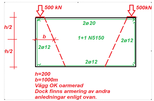 Illustrerar med ett exempel enligt nedan, där det ligger armering i väggen av andra anledningar än den med hänsyn till bärförmåga för väggen, exempelvis för ingjutningsgods eller för att förhindra krymp och krypsprickor. Överst ligger dock en armering för att förhindra hörnspjälkning på grund av punktlasten.