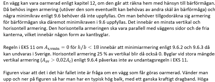 Hej, Jag undrar över om man behöver byglar för de fria kanterna för en "oarmerad" vägg där man har armering även om den inte är nödvändig med hänsyn till bärförmågan? Enligt 9.6.3 (1) anges det att man ska ha As,hmin på alla ytor och med de fria kanterna. Enligt EKS 11 9.6.2(1) finns ingen undra gräns för Asv,min för väggar med h/b mindre än 18, dock ska man alltid använda 25 % av den vertikala armering enligt EKS11 9.6.3(1). Bör man då lägga in byglar vid de fria kanterna och varför?