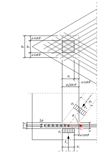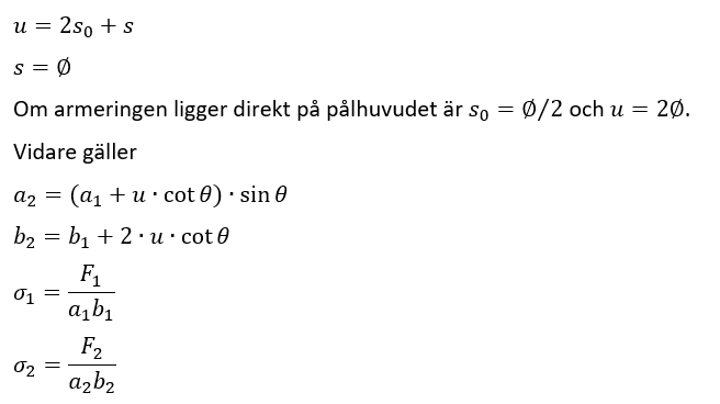 Den vertikala tryckspänningen vid pålhuvudet blir helt enkelt pålkraften dividerat med pålhuvudets area. När det gäller tryckspänningen i den lutande trycksträvan finns ingen direkt vägledning i SS-EN 1992-1-1 för detta fall, men man skulle kunna göra en utvidgad tolkning av figur 6.27 enligt nedanstående förslag, se figur nedan: