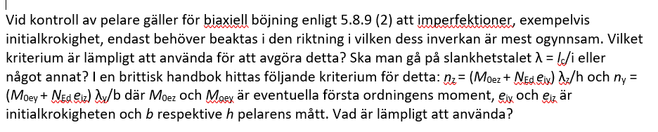 Fråga: Hur skall andra ordningens moment beräknas i bruksgränstillståndet för pelare/väggar? Om man väljer styvhetsmetoden ska man då beräkna enligt ekvation 5.28 men med styvheten EI beräknad på vanligt sätt med hänsyn till krypning och uppsprickning? Ekvation 5.21 gäller väl bara för brottgränstillståndet? Hur gör man i bruksgränstillståndet om man väljer krökningsmetoden? I brottgränstillståndet används dimensioneringsvärdet på töjningen vid krökningsberäkningen men om man då i bruksgränstillståndet använder det karakteristiska värdet på töjningen blir ofta krökningen större i bruksgränstillståndet än i brottgränstillståndet, även om man tar hänsyn till skillnaden i normalkraftens storlek. Detta verkar inte rimligt.