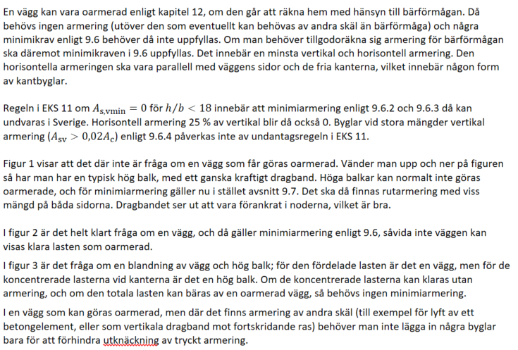 Ett konkret exempel: En vägg med en fönsteröppning som är 1210 mm bred och med ett 3200 mm högt överstycke över fönstret. Det är beskedliga laster på väggens överkant? Det känns inte motiverat med minarmering både vertikalt och horisontellt. Går det att på något sätt verifiera/bevisa att det inte är nödvändigt med minarmering? Om det trots allt måste in minarmering; räcker det om vertikala stänger förankras förbi den övre trycksträvan eller måste vertikala armeringen gå hela vägen upp till väggens överkant?